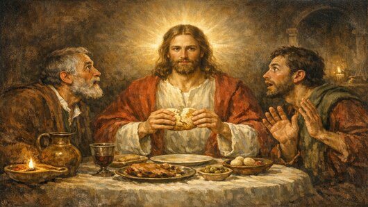 Als sie Emmaus erreichen, laden sie den Fremden ein, bei ihnen zu bleiben. Beim gemeinsamen Mahl nimmt er das Brot, spricht den Segen, bricht es und gibt es ihnen.